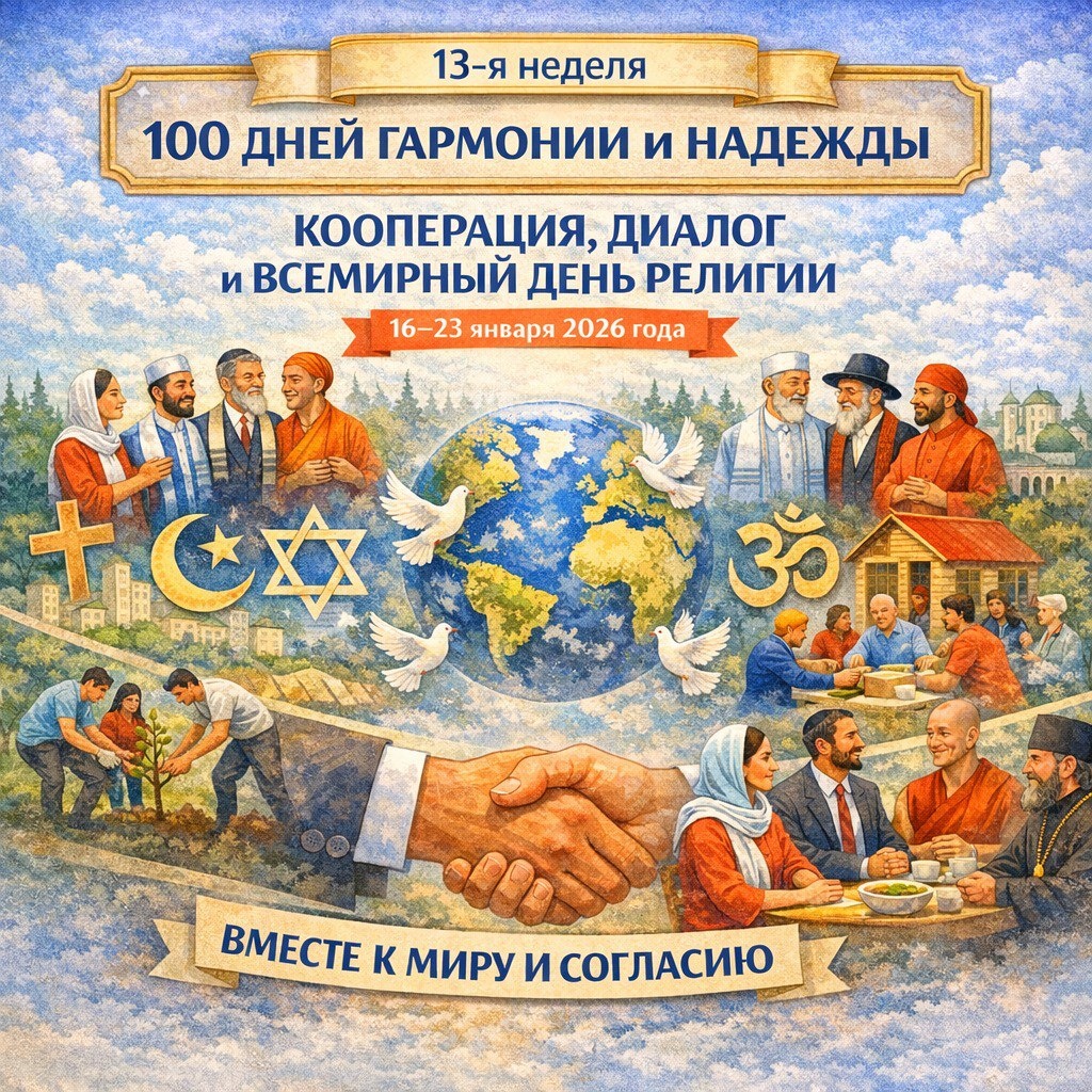 ) 🤝 Кооперация • 🕊 Диалог • 🙏 Всемирный день религии Наша кампания «100 дней гармонии и надежды» выходит на финишную прямую — и сейчас особенно ясно: мир начинается ближе, чем кажется. Он начинается с доверия: в семье, в соседстве, в команде, в обычных человеческих отношениях. На этой неделе звучат две опоры: 🤝 кооперация и взаимопомощь — как практический язык доверия; 🕊 межрелигиозный диалог — как культура уважения и достоинства. 🙏 18 января (воскресенье) — Всемирный день религии Идея дня простая: религия призвана быть источником нравственной силы и взаимопонимания, а не раздора. Традиции разные, но ценности часто общие: милосердие, ответственность, честный труд, уважение к человеку, забота о семье и ближнем. 🇷🇺 Россия: свобода совести и уважение в жизни Мы живём в многоконфессиональной стране — и именно культура спокойного, уважительного общения помогает сохранять согласие и объединяться для добрых дел. 🌍 Международный контекст ООН ежегодно проводит Всемирную неделю гар