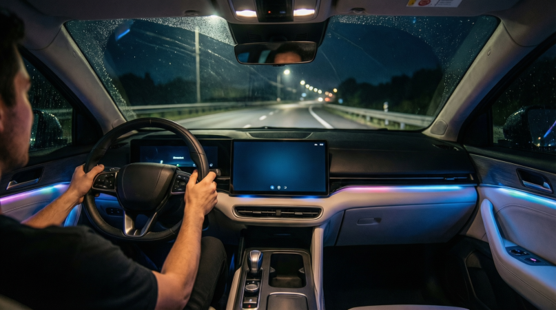 Кадр 1 (Интерьер, салон). 21:30. За городом темно. Водитель за рулем уже три часа. Мягкая многоцветная ambient-подсветка в дверях и на панели переключается с нейтрально-белого на спокойный глубокий синий. Цвет выбран не просто так – исследования показывают, что он снижает зрительное напряжение в темноте. На центральном экране интерфейс автоматически переходит в темный режим, убирая любые яркие белые пятна.