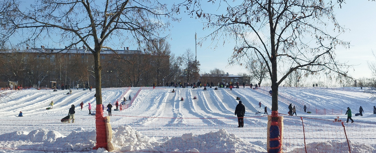 Тюбинговая горка, до которой мы пытались доехать несколько лет, находится в парке Акведук в Ростокино (он же парк «Яуза») на пересечении улиц Малахитовая и Бажова. Место популярное и зимой, действительно, оживлённое.