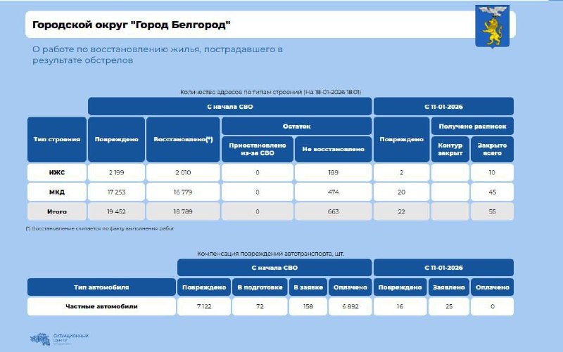 Основные цифры за прошедшую неделю: 🔹 количество пострадавших объектов увеличилось на 22, также повреждения получили 16 автомобилей; 🔹восстановлено 55 жилых объектов при плане 50, всего осталось восстановить 663; 🔹 план на эту неделю: 55 объектов; 🔹 подготовлены материалы на 25 автомобилей. Работы по оценке планируется завершить до 25 января. Мэрия|Белгород в 📱 ТГ 📱 ВК 💜 MAX