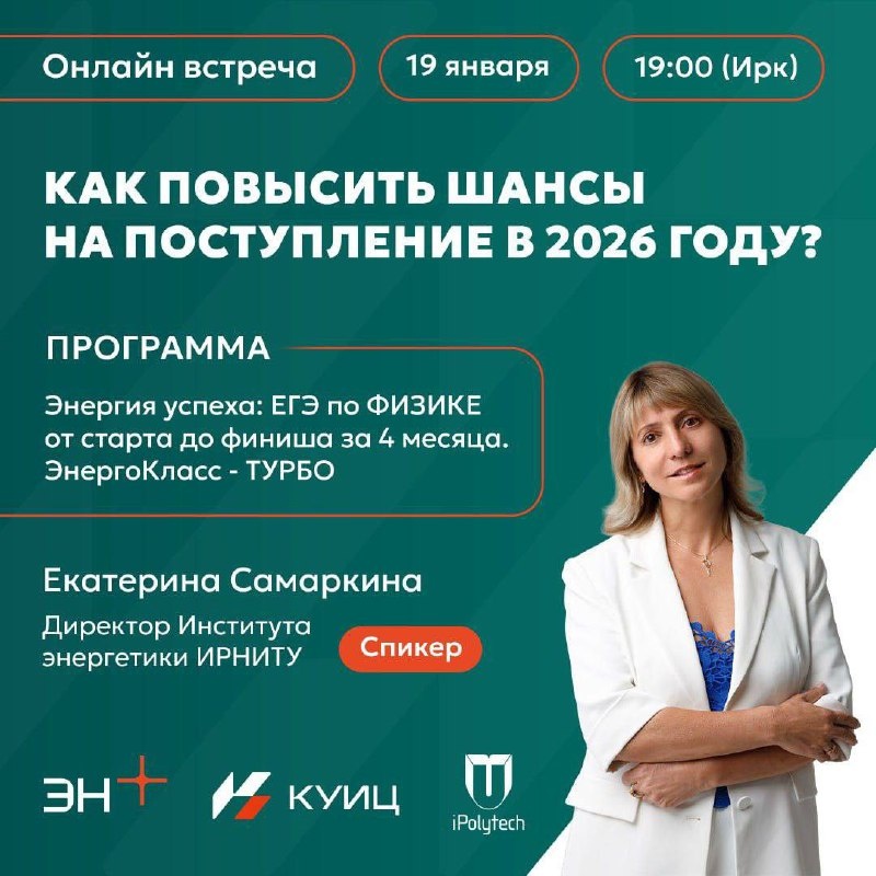 ! ⚡️ Приглашаем абитуриентов и родителей на онлайн-встречу с Екатериной Самаркиной, директором Института энергетики ИРНИТУ. Тема: «Энергия успеха: ЕГЭ по физике — от старта до финиша за 4 месяца». Это специальный интенсив в рамках программы «ЭнергоКласс — ТУРБО». Участие бесплатно. Дата: 19 января, 19:00 (ирк). На встрече вы узнаете: 🔘Как эффективно подготовиться к ЕГЭ по физике даже за ограниченное время — методика от ключевого вуза-партнера. 🔘Как получить дополнительные 7 баллов к ЕГЭ при поступлении в Институт энергетики ИРНИТУ — один из бонусов участия в проекте от Эн+ «ЭнергоКлассах». 🔘Советы по поступлению на востребованные инженерно-энергетические специальности — о траектории от школьной скамьи до карьеры в ведущей компании. Регистрация и ссылка на трансляцию 📎