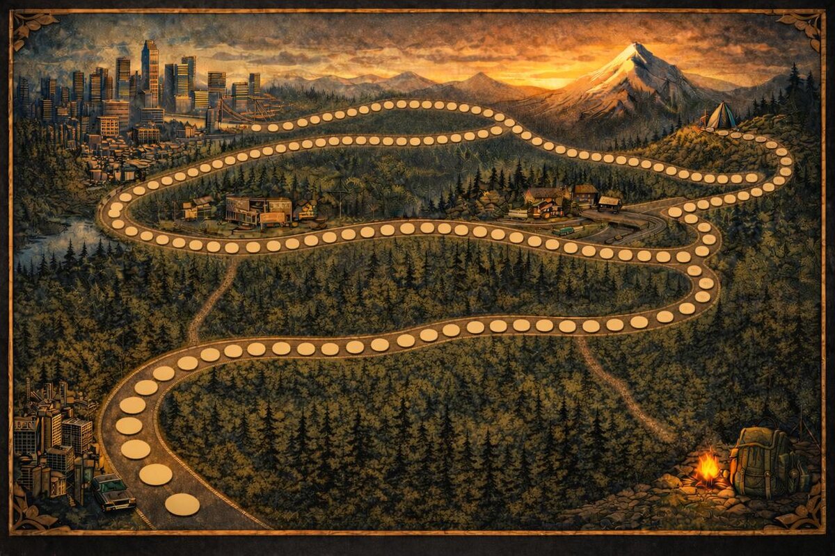 Ну круть же? Круть! Давайте я расскажу подробнее, что вас ждёт. Итак, вы стартуете из города «Рутинск». Это место в представлении не нуждается. Городские джунгли давят, навязывая правила. Социальные сети твердят, что тебе нужно есть, носить