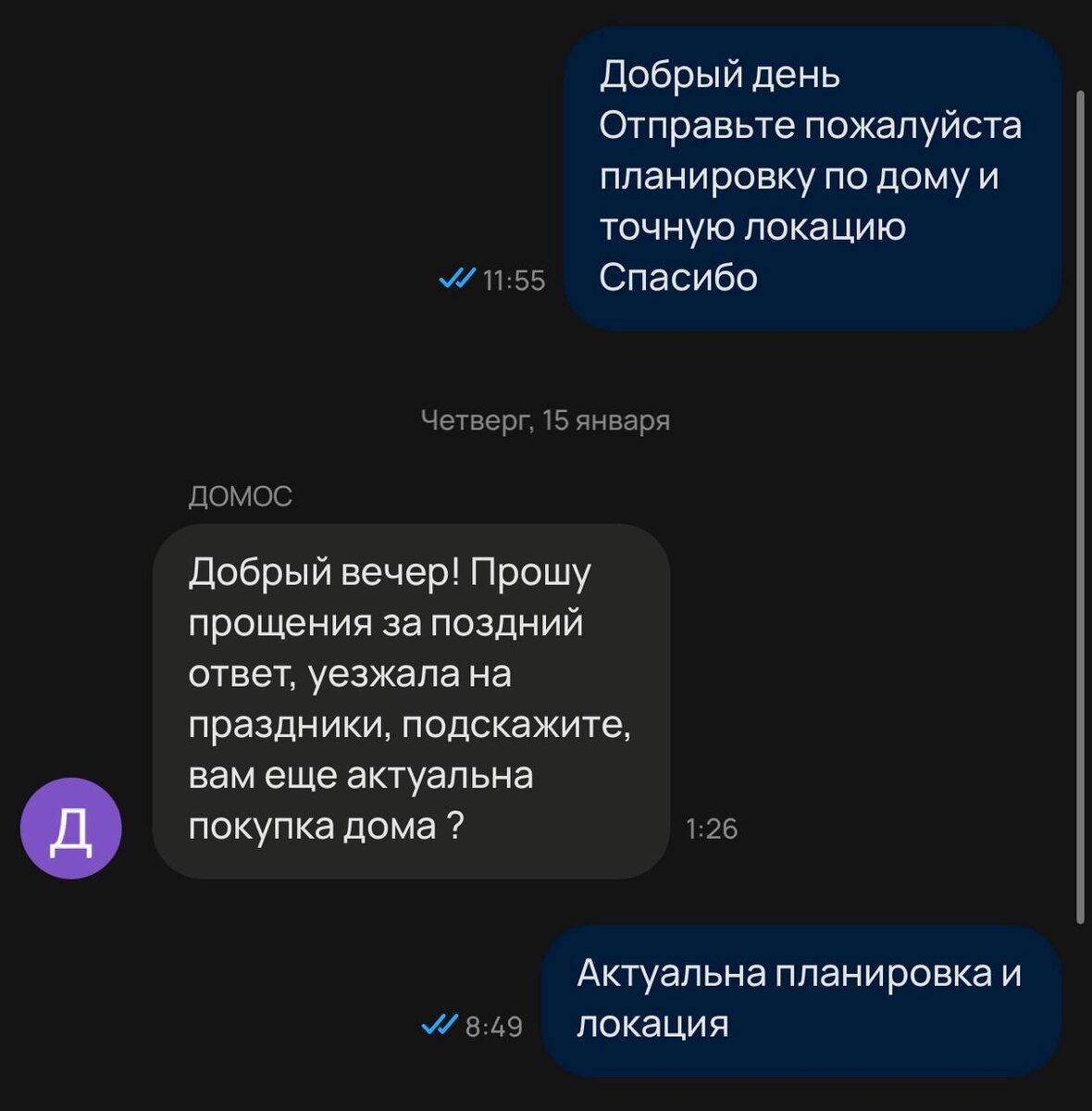 На этот раз агентство недвижимости Домос. Сразу поясню, что к самому агентству я ни в коем случае никаких претензий не имею, работал там с кучей риэлторов, обычно без происшествий. Но тут больше вопрос клиентского сервиса. Если вы уже открыли скрины, то поняли, что я просто прошу планировку и локацию загородного дома. 😊 Вопрос 1. Ты риэлтор. Ты работаешь в крупном коворкинге таких же риэлторов. Ты ответственна за продажу дома перед собственником/застройщиком. Ну неужели тебя никто не научил, что при продаже ЛЮБОГО объекта недвижимости всегда нужна планировка и прямо в объявлении. Я даже на каждую свою студию рисую 3Д тур и четко выверяю линии по размерам. Ну вот почему их нет? И это не только тут в целом, многие этим пренебрегают. 😊Вопрос 2. Чем это я так отличаюсь, что вы не можете мне локацию отправить? Думаете я приеду к вашему клиенту в этот дом и уведу его у вас? Или какая причина? Важно: локацию спрашиваю не просто так, потому что подобные агентства могут выставить дом