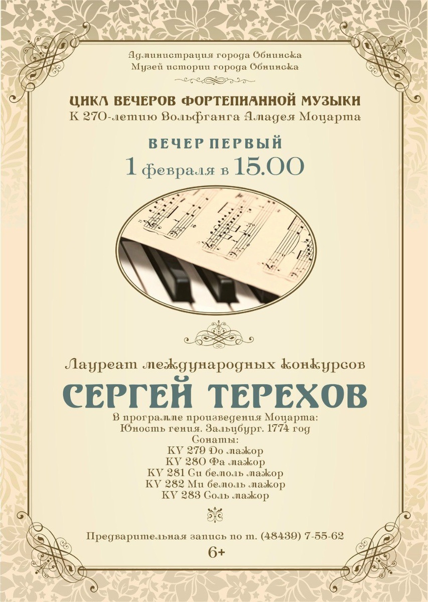 международных конкурсов Сергея Терехова. Сергей Дмитриевич является правнуком Виктора Петровича Обнинского, имя которого тесно связано с историей нашего города. Талантливый пианист уже много лет поддерживает дружеские связи с Обнинском, его хорошо здесь знают и всегда тепло встречают. В 2026 году в течении четырех вечеров Сергей Терехов будет исполнять произведения Вольфанга Амадея Моцарта. Предварительная запись по т. +7 (484) 397-55-62. Обнинск, пр-т Ленина, 128. 👍 Подписаться | Ваша реклама