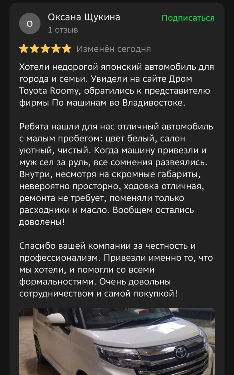 👍 🔵🔵🔵🔵🔵 👍 Toyota Roomy - отличный автомобиль за свой бюджет. И наш клиент Оксана из г. Краснодар попала в точку, когда решила заказать из Японии этот микровэн ✔️ Такие тёплые отзывы греют наши сердца в эти холодные зимние дни. Благодарим за сотрудничество ❤️ 📨 Пишите "ПО МАШИНАМ" – мы привезем авто вашей мечты с большой выгодой! ✍️МЕНЕДЖЕР ЗАХАР ☎️ +7(902)481-18-22 🗺 Отзывы 🚗 Каталог Дром 📷 YouTube канал с обзорами 🟦 Сообщество VK