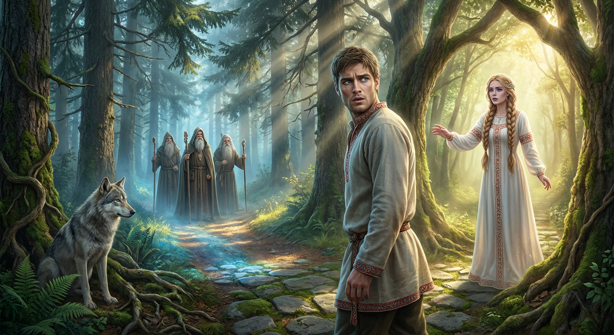 В те времена, когда сосны были выше, а небо чище, жил юноша по имени Светозар. Его глаза цвета летнего неба видели то, что скрыто от других: музыку ветра в кронах, печаль старого камня, радость ручья, встречающего восход. Когда он шёл по лесу, волки шли рядом, не как хищники, а как любопытствующие соседи; медведицы позволяли ему гладить своих неуклюжих медвежат.