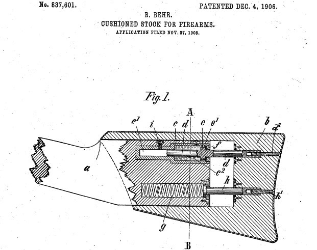 День добрый! На схеме к патенту 1906 года авторства Бехра можно увидеть применение гидравлического тормоза в несвойственном ему месте. Гидравлический тормоз это противооткатный прибор, применяемый для торможения ствола орудия в артиллерии, его суть в том, что при отдаче начинается воздействие на цилиндр или поршень, они начинают двигаться навстречу друг другу, что увеличивает давление на жидкость. В поршне выполняют отверстия, через которые жидкость перетекает во вторую часть цилиндра, энергия отдачи тратится на преодоление местных гидравлических сопротивлений, что уменьшает откат, а в нашем случае отдачу оружия. В нашем случае изобретатель решил поставить гидротормоз прямо в приклад и понизить отдачу. Из интересного, гидравлика применена именно в верхней части приклада, так как для большинства ружей именно в этой точке отдача при прочих равных будет выше. Нижний поршень это комбинация пружины и возможно пневматического тормоза, работающего на сжатии воздуха. Очевидно, что распростране