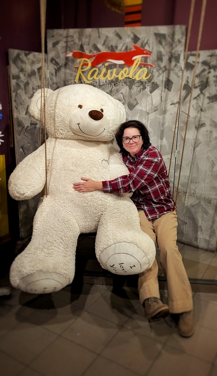 А на первом организована небольшая, фотозона. Медведь был отдельно, качели - тоже, но мы их объединили. Так лучше, правда?