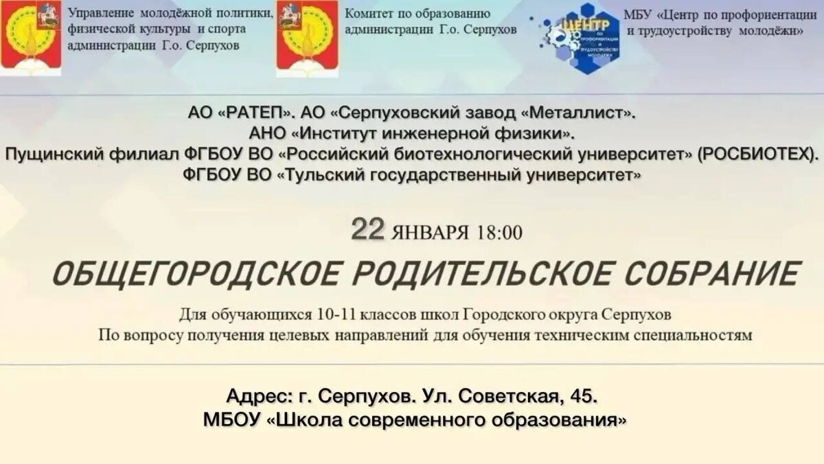Внимание родителей и обучающихся 10-11 классов! Центр по профориентации и трудоустройству молодежи приглашает Вас и будущего выпускника на родительское собрание по вопросу получения целевых направлений в высшие учебные заведения, которое состоится 22 января 2026 года в 18:00 в МБОУ "Школа современного образования" (школа 1) по адресу: г.Серпухов, ул. Советская, д.45 ☎️ Тел. для справок: 8 (4967) 72-15-88, 8(496)772-19-05 АО «РАТЕП», АО «Серпуховский завод «Металлист» и АНО «Институт инженерной физики» проводят набор кандидатов для поступления по целевому обучению в ВУЗах на технические специальности в 2026 году.