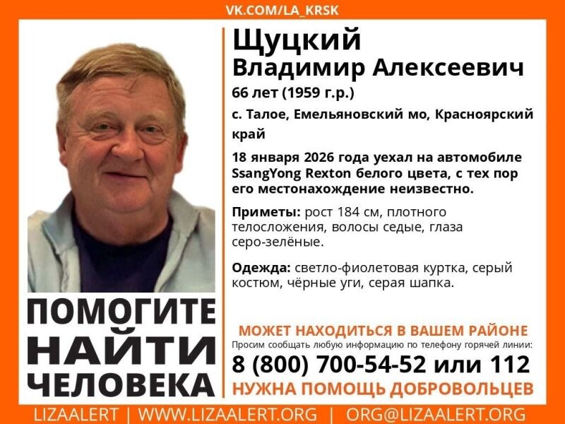 Бесследно исчез 66-летний отец президента фонда «Красноярский край против наркотиков» Алексея Щуцкого. Как сообщает поисковый отряд «ЛизаАлерт», 18 января 2026 года Владимир Щуцкий уехал на автомобиле SsangYong Rexton белого цвета из села Талое, Емельяновского округа, и с тех пор его местонахождение неизвестно. Приметы: рост 184 см, плотного телосложения, волосы седые, глаза серо-зеленые. Одежда: светло-фиолетовая куртка, черные угги, серая шапка. «Если вам что-то известно о пропавшем, звоните на горячую линию 8-800-700-54-52 (звонок бесплатный)», — обращаются к населению края поисковики. Фото: Поисковый отряд «ЛизаАлерт» Красноярского края