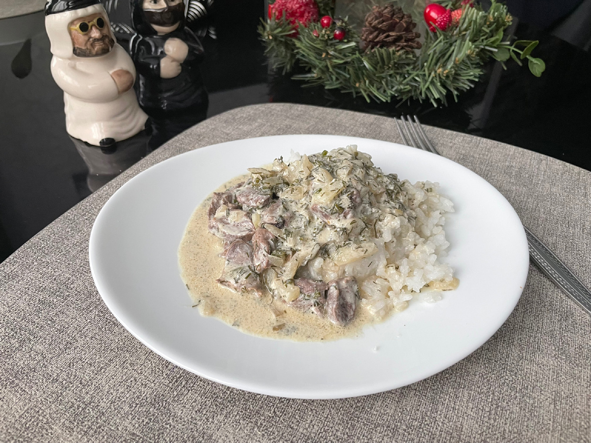 Добавить в сковороду сметану и влить воду, всё хорошо перемешать и накрыть крышкой.