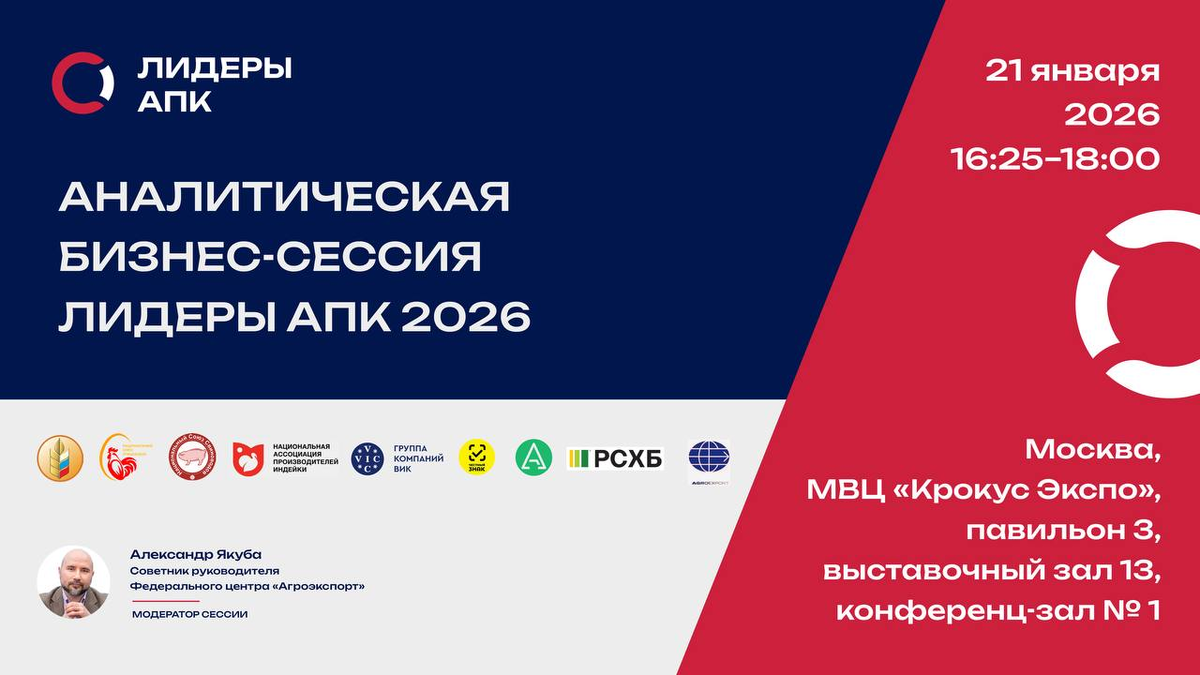 21 января 2026 года в рамках выставки AGRAVIA TECH & PRO EXPO – 2026 пройдет аналитическая бизнес-сессия «Лидеры АПК-2026». Организаторами мероприятия выступают отраслевой проект «Лидеры АПК» и Группа компаний ВИК. Сессия соберет ключевых представителей отрасли, чтобы обсудить тренды развития АПК и рынка животного белка в 2026 году, включая: Модератор сессии — Александр Якуба, советник руководителя Федерального центра «Агроэкспорт». Среди спикеров — руководители ведущих компаний, отраслевых союзов и эксперты отрасли. Регистрация на мероприятие обязательна — переходите по ссылке Присоединяйтесь к сессии, чтобы получить глубокий аналитический взгляд на развитие отрасли, обсудить ключевые тренды и обменяться опытом с лидерами АПК!