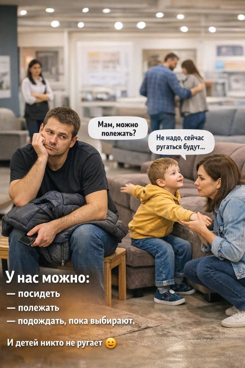 , а семья всё ещё в пятый раз сравнивает «почти одинаковые» диваны. Ты ничего плохого не делаешь. Просто садишься на диван и ждешь… Не прыгаешь. Не ешь. Даже не дышишь громко. И тут: — Мужчина, с дивана встаём. Ну класс 🙃 Сидишь потом на скамеечке в проходе с курткой, как провинившийся. А рядом ребёнок аккуратно тянется: — Мам, можно полежать? — Не надо, сейчас ругаться будут… Знакомо, да? Рассказываем, как у нас. У нас можно: — посидеть — полежать — подождать, пока выбирают И да - детей мы тоже не ругаем, если они залезли на диван, легли, покатались или устроились «как дома». Потому что диван - это не музейный экспонат. Его покупают не глазами, а спиной, шеей и настроением. Для нас диван - это про семью. Про вечер. Про мультики, гостей и «мам, я тут посплю». Единственные просьбы - простые и понятные: 🧥 снимаем верхнюю одежду 👟 разуваемся Всё. Без замечаний. Без неловкости. Без «ну вы же понимаете- это выставочный образец…» Так что если вам знакомо это чувство — когда хочется п