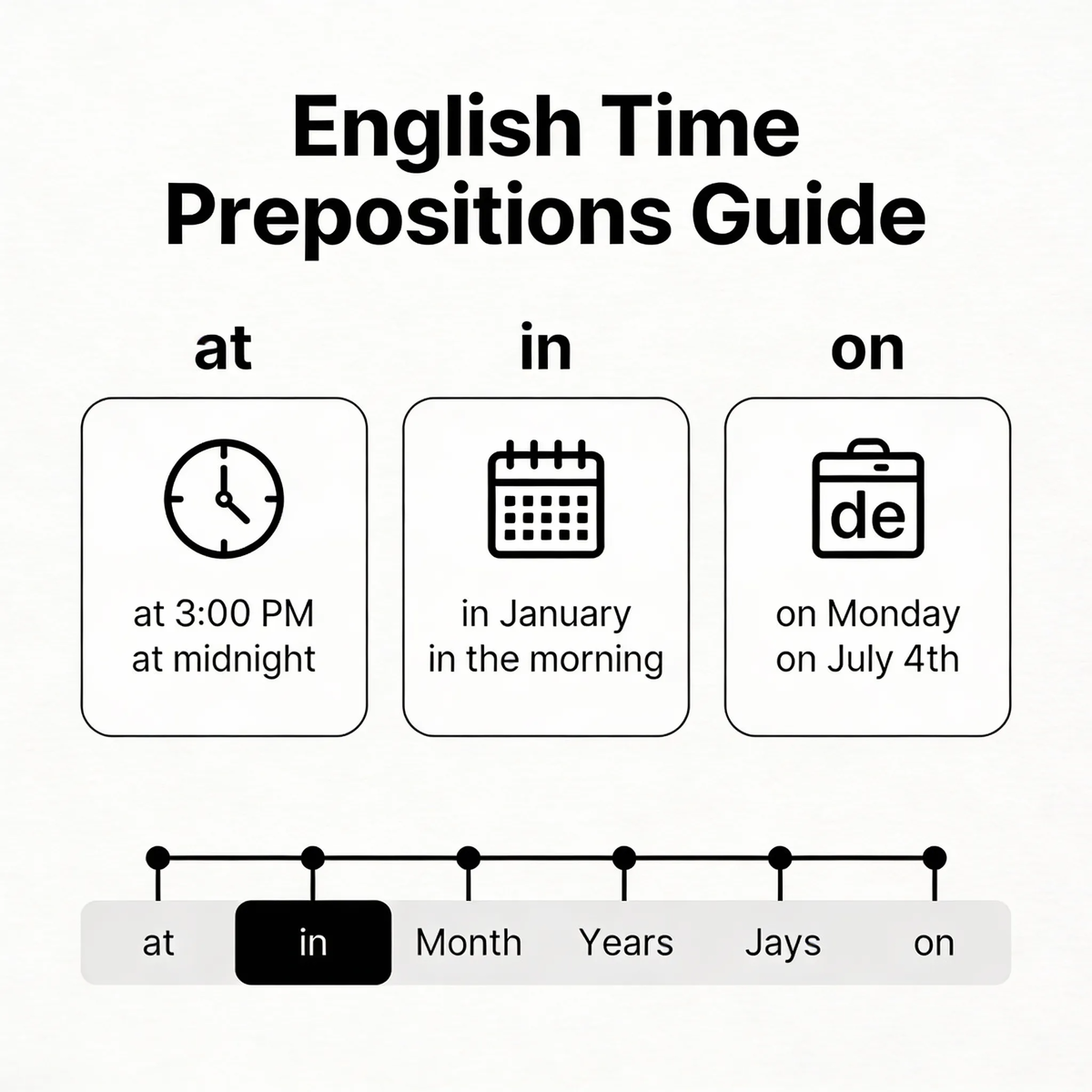 this, last, next, every: this Monday, last year, next week, every day.