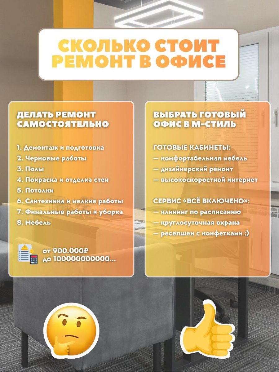 ❓ Друзья, решили посчитать, во сколько вам реально обойдётся ремонт офиса, если делать его самостоятельно. Цифры — на экране. И это ещё без нервов, сорванных сроков и постоянного контроля подрядчиков. Зачем тратить сотни тысяч рублей и месяцы времени, если можно заехать в уже готовые офисы М-СТИЛЬ ОФИС?🔥 У нас вы арендуете пространство, где всё уже включено в стоимость: ✅ готовый ремонт ✅ мебель ✅ быстрый интернет ✅ клининг по расписанию ✅ ресепшен ✅ охрана помещения Вы просто заходите и начинаете работать — без ремонтов, доплат и скрытых расходов. Напишите нам — подберём офис под ваш бизнес .
