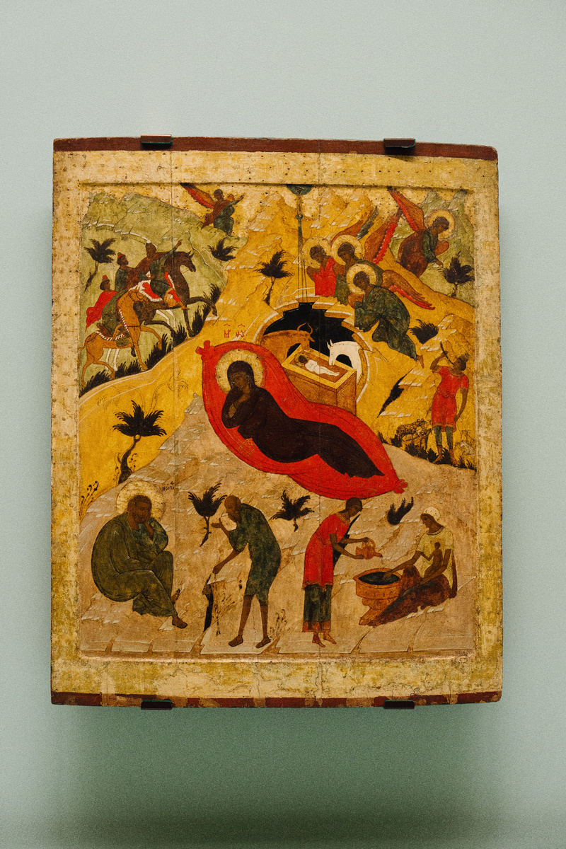 Москва прекрасна в любое время года. В этом можно убедиться, посетив выставку «Образ Москвы в русском искусстве из коллекции Государственного Русского музея» в Центральном павильоне ВДНХ. Сегодня мы поговорим о прекрасной зимней Москве и её праздничных традициях. Долгое время самым главным зимним праздником на Руси было Рождество, которое даже называют «Зимняя Пасха». В зале, где представлено древнерусское искусство, можно увидеть икону середины XVI века «Рождество Христово», происходящую из Успенского собора Тихвинского монастыря. Икона повествует об этом евангельском событии подробно и детально. В центре доски – пещера с яслями, в которых лежит Богомладенец. Рядом возлежит Богородица. В иконах, где изображаются события не здесь и сейчас, а в вечности, нет привычного нам принципа единства места и времени. Так, в пространстве иконы присутствует еще одно изображение младенца Христа, в сцене омовения, а в верхней части доски мы видим эпизоды, происходящие в разных местах – слева 3 волхва