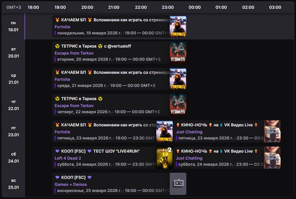 и пора бы уже нормально вернуться к стримам) 📢🗓ОРИЕНТИРОВОЧНОЕ РАСПИСАНИЕ 🗓 📆 ПН. 19.01 ⏰ 19:00 🎮 FORTNITE 🔫 🥇 КАЧАЕМ БП 🥇 Вспоминаем как играть со стримерами и подписчиками (follow) 🔥 !играть 📆 ВТ. 20.01 ⏰ 19:00 🎮 Escape from Tarkov 🔫🔫 ☢️ ТЕТРИС в Тарков ☢️ с @vertualoff 📆 СР. 21.01 ⏰ 19:00 🎮 FORTNITE 🔫 🥇 КАЧАЕМ БП 🥇 Вспоминаем как играть со стримерами и подписчиками (follow) 🔥 !играть 📆 ЧТ. 22.01 ⏰ 19:00 🎮 Escape from Tarkov 🔫🔫 ☢️ ТЕТРИС в Тарков ☢️ 📆 ПТ. 23.01 ⏰ 19:00 🎮 FORTNITE 🔫 🥇 КАЧАЕМ БП 🥇 Вспоминаем как играть со стримерами и подписчиками (follow) 🔥 !играть ⏰ ПОЛНОЧЬ 🍿 КИНО-НОЧЬ на 📱 VK Видео Live 🍿 📆 СБ. 24.01 ⏰ 19:00 🎮 Left 4 Dead 2 💜 КООП [FSC] 💜 ТЕСТ ШОУ "LIVE4RUN" с Бобром (WinCond) ⏰ ПОЛНОЧЬ 🍿 КИНО-НОЧЬ на 📱 VK Видео Live 🍿 📆 ВС. 25.01 ⏰ 19:00 🎮 КООП [FSC] 💜 КООП [FSC] 💜 пока не определились с игрой) Расписание ориентировочное! 1️⃣ Приходите смотреть на 📺 Twitch и ОБЯЗАТЕЛЬНО ставь ❤️ на 📱 VKВидеоLive!! ⏺ Все наши ре