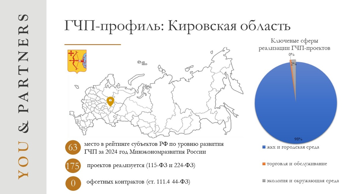 🏆 Место в рейтинге - 63 Согласно итоговой оценке рейтинга субъектов РФ по уровню развития ГЧП за 2024 год (Минэкономразвития России), Кировская область занимает 63 место, не изменив позиций по сравнению с 2023 годом). 🧮 Количество проектов По данным РОСИНФРА в регионе реализуется 175 ГЧП-проектов (учтены проекты по 115-ФЗ и 224-ФЗ на стадиях от предынвестиционного этапа до завершения проекта). 🧩 Сферы реализации проектов: - ЖКХ и городская среда (171 проект); - торговля и обслуживание (1 проект); - экология и окружающая среда (3 проекта). Примеры проектов: 🧺 Концессионное соглашение в отношении объекта здания прачки Орловского городского поселения (КС заключено 27.01.2016 на 10 лет, объем инвестиций 1 млн. руб.). ♻️ Концессионное соглашение в отношении объектов по обращению с твердыми коммунальными отходами города Слободского Кировской области (КС заключено 31.03.2016 на 10 лет, объем инвестиций 10 млн. руб.). 📑Офсетные контракты в регионе: 0 шт. По данным zakupki.gov.ru в регионе