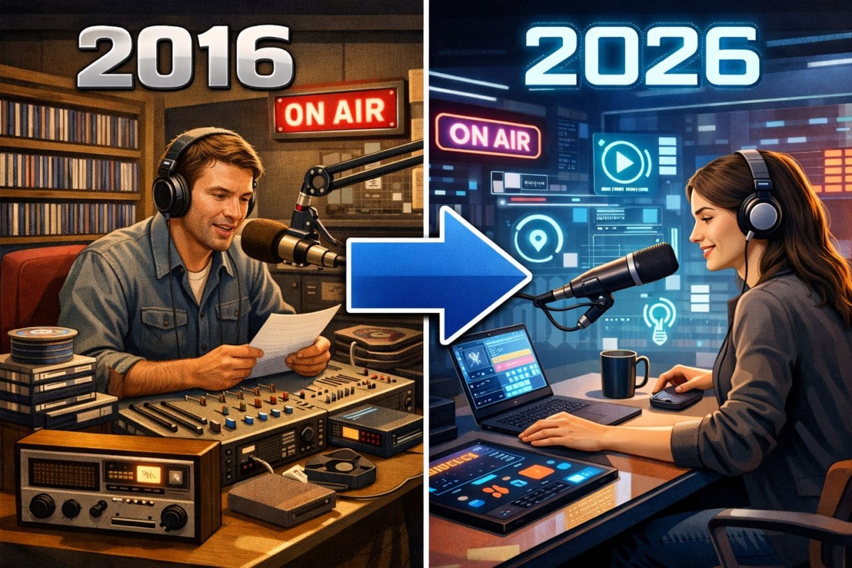 В левой - состояние радиовещания в 2016 году и большой титр "2016", в правой - состояние радиовещания в 2026 году и титр "2026", между ними - знак перехода из событий десятилетней давности в сегодняшний день. Решил последовать тренду тренду из соцсетей (сравнение сюжетов из 2016 и сюжетов из 2026). Полез в архив, почитать итоги радиовещания 2016, а к ним итоги радиовещания 2015, написанные в 2016м, а к ним итоги радиовещания 2017/18, чтоб так, по динамике... Вообще, не люблю читать старые тексты. Всё, что было - сплыло... но, тут пролистал. И не могу избавиться от чудовищного ощущения - застоя в индустрии. Оказывается, многое, что, казалось бы, было "вчера" - на самом деле было 10 лет назад. Так много всего поменялось в жизни, а в индустрии радио в целом не поменялось почти ничего. Грустновато... Для желающих сравнить: > ИТОГИ РАДИО 2015 > ИТОГИ РАДИО 2016 > ИТОГИ РАДИО 2017 > ИТОГИ РАДИО 2025 часть 1 > ИТОГИ РАДИО 2025. Часть 2
