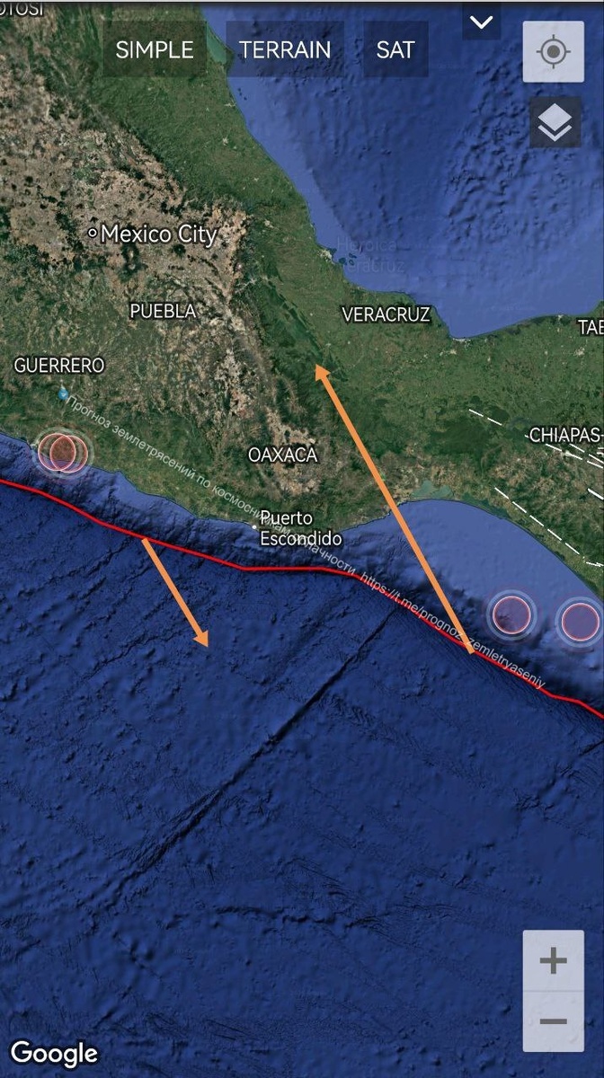 В течение 7 дней есть вероятность землетрясения М5.5-6 для Мексики возле отмеченной рифтовой зоны