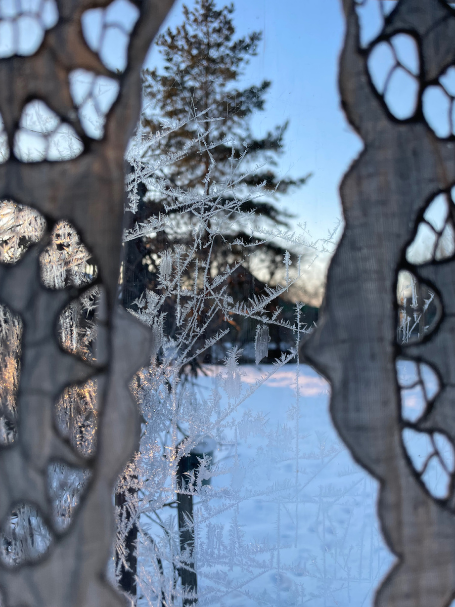 Пластиковые окна не покрываются морозными кружевами. Смешно сказать, мои дети до недавнего времени видели узоры на стеклах только в книгах. А на новой даче почти машина времени: строченые шторы и заиндевелые стекла.