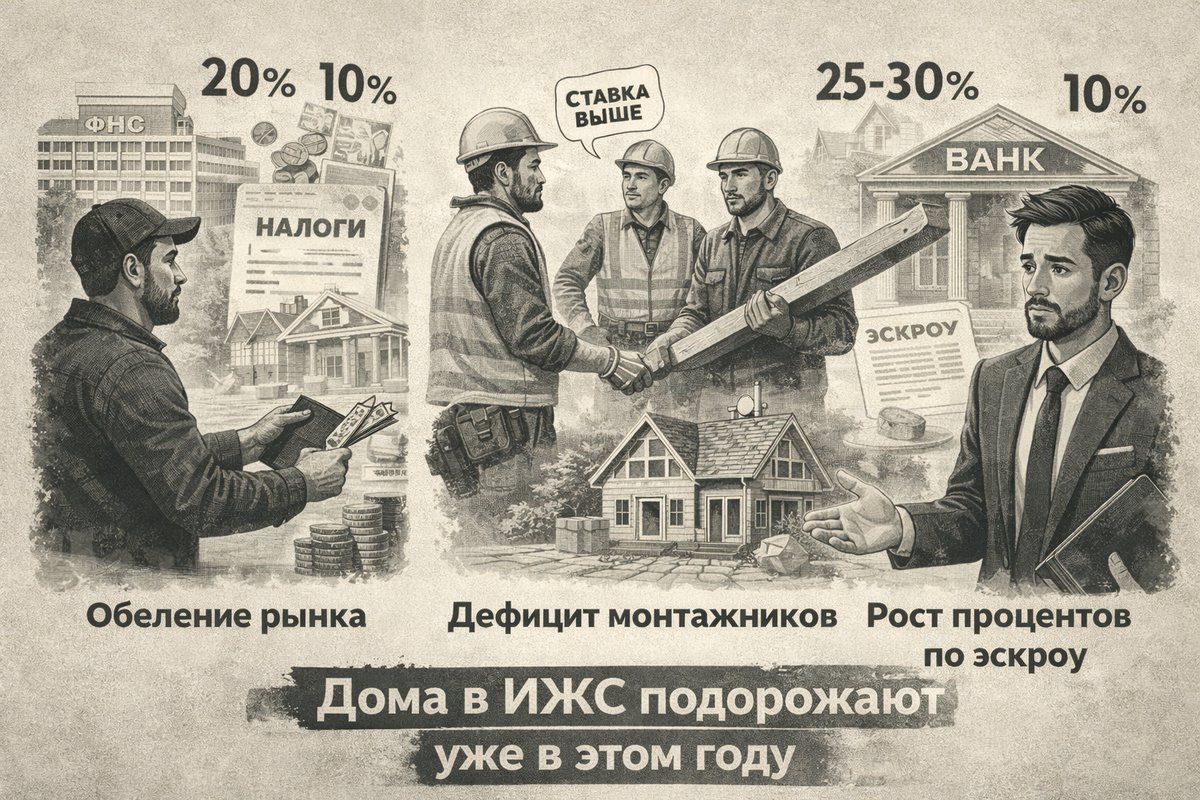 Я 25 лет строю дома. За это время появляется не «мнение», а насмотренность. Поэтому я могу спокойно сказать: рост цен в малоэтажном строительстве – это не прогноз, а следствие уже идущих процессов. Причина №1. Рынок выходит из тени Много лет ИЖС жил по простой схеме: ИП, самозанятые, 2–3 бригады, работа «в чёрную», без налогов, без кадров, без ответственности. Построили 5–10 домов и исчезли. Теперь с эскроу-счетами так работать невозможно. Компании вынуждены: -объединяться в структуры, -платить НДС, -платить налог на прибыль, -выводить зарплаты «в белую». Что это значит в цифрах: НДС +20%, налог на прибыль ещё +10%, белая зарплата вместо конверта ещё ~30% к фонду оплаты труда. Итого: плюс 20–25% к цене дома, только за счёт обеления бизнеса. Причина №2. Дефицит и удорожание монтажников Государство активно ужесточает контроль за миграцией. Монтажники, которые работали по 10–15 лет, с семьями, документами массово выбывают. На смену приходят наши, славянские ребята: • работают медленнее, •
