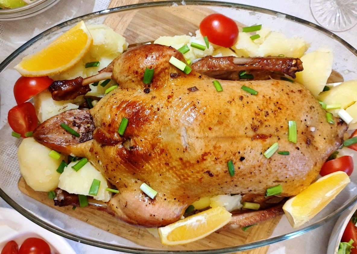 Утка, запеченная в рукаве - это отличный вариант главного блюда на праздничный стол. Во-первых, это красиво! Мясо получается сочное, нежное, ароматное, просто тает во рту. Рецепт проверенный и Ваши гости будут в восторге. ИНГРЕДИЕНТЫ: ПРИГОТОВЛЕНИЕ: 1. Утку обработать, помыть, обсушить бумажным полотенцем, вырезать жировые железы, удалить локтевую часть крыла. Натереть солью снаружи и внутри. 2. Приготовить маринад: смешать соевый соус, апельсиновый сок, растительное масло, измельченный чеснок, перец. 3. Переложить утку в глубокую емкость и тщательно обмазать ее со всех сторон маринадом. Накрыть пленкой и оставить мариноваться на 2-3 часа. Можно оставить на ночь, тогда надо убрать в холодильник. 4. Положить мясо в рукав для запекания, добавить туда маринад, если остался, проткнуть рукав в двух-трех местах и поставить в духовку на 30 мин при 200°, затем убавить температуру до 180°. Через час разрезать пленку, полить утку соком и поставить в духовку до готовности. 5. Картошку на гарнир с