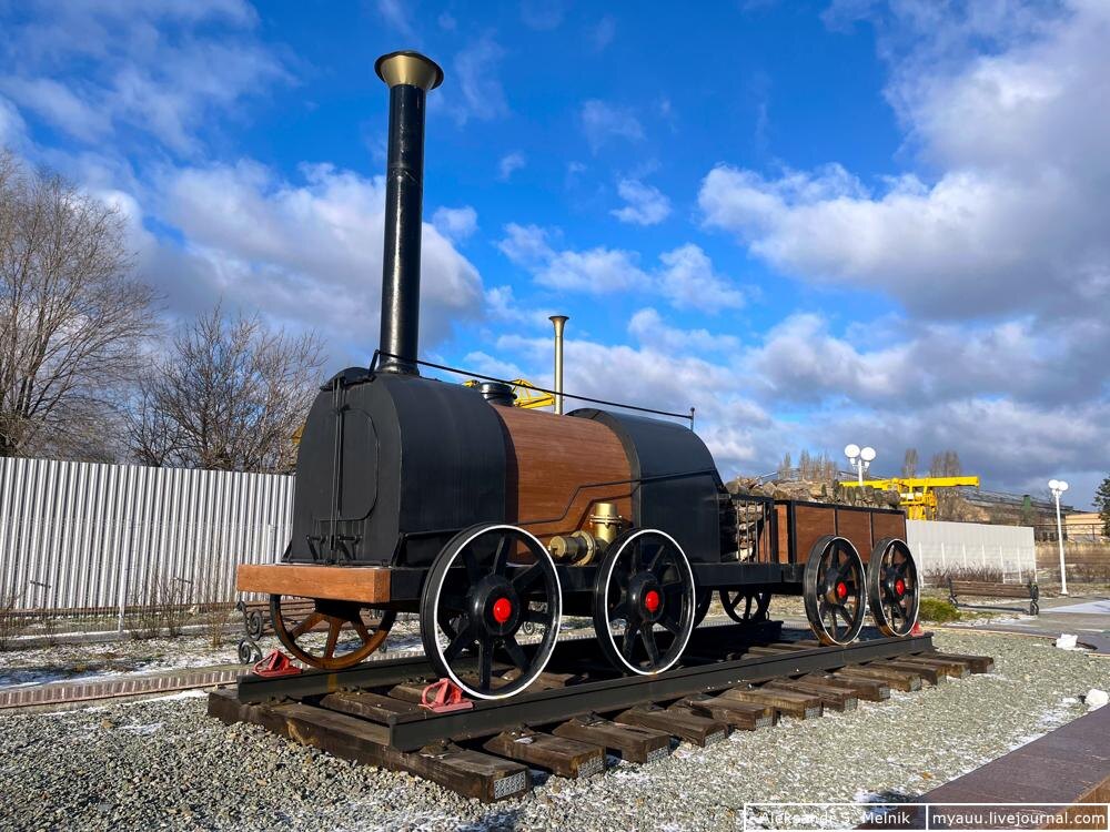 Дата съёмки - 13.12.2025. Первые Российские локомотивы были построены в 1830-х годах отцом и сыном Черепановыми на Нижнетагильских заводах. Начнём с Черепанова, который находится в сквере ДК Карла Маркса, рядом с Музеем Юго-Восточной железной дороги (Никитинская улица, дом 1). Вход в сквер оказался закрыт, а сам макет локомотива стоит в центре за деревьями. К сожалению, на тот момент у меня был телефон без оптического зума, поэтому качество получилось совсем не ок.