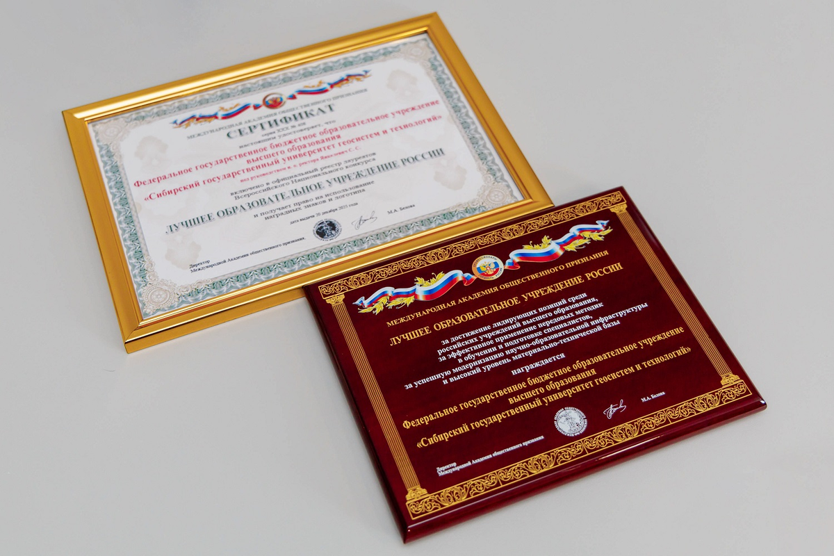Сибирский государственный университет геосистем и технологий официально признан «Лучшим образовательным учреждением России» по версии Международной академии общественного признания. Академией отмечены лидирующие позиции университета в сфере высшего образования, эффективное применение передовых методик, современная инфраструктура и высокий уровень материально-технической базы. Что значит эта награда для студентов и сотрудников? Признание Международной академии – это стимул двигаться вперед, расширять горизонты и достигать новые вершины. В подтверждение присвоенного статуса вузу вручены: сертификат установленного образца с уникальным номером, зарегистрированным в соответствующем реестре; настенная награда, символизирующая признание заслуг; электронный логотип для использования в официальных материалах и на сайте вуза. Информация подготовлена Центром медиа и коммуникаций