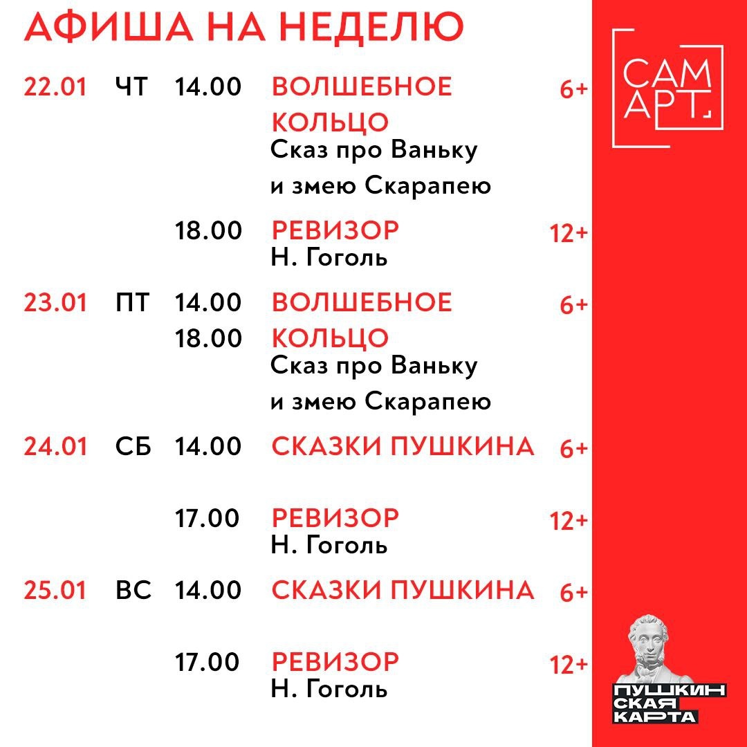 Разбираемся куда и когда отправляемся: Едем по городу Парижу: 🟥«Волшебное кольцо» | 6+ 22 января | 14:00 23 января | 14:00 и 18:00 Купить билеты Отправляемся в город N: 🟥«Ревизор» | 12+ 22 и 27 января | 18:00 24 и 25 января | 17:00 Купить билеты Плывём мимо острова Буяна: 🟥«Сказки Пушкина» | 6+ 24 и 25 января | 14:00 Купить билеты