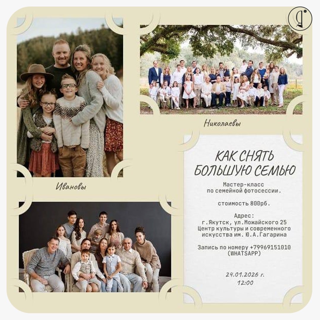 » #МК Вы узнаете: - как планировать фотосессию; - как выбрать локацию; - что такое геометрия кадра. 24 января | 12:00 ЦКиСИ им. ЮА Гагарина, Можайского, 25 800 руб. +79969151010 Online Якутия | Ждем вас в МАХ