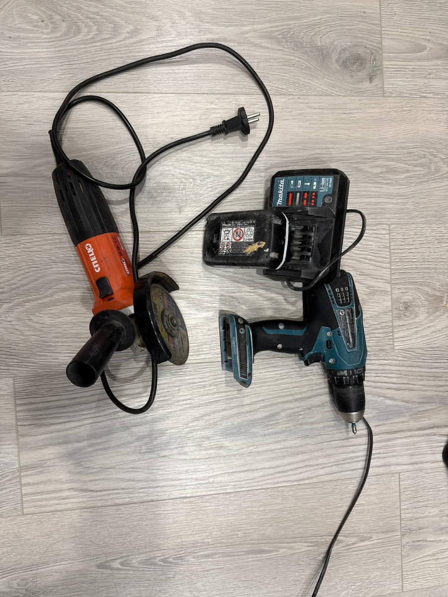 Привет, девчонки! 👋 Сегодня я решила покорить мир ремонта. На фото — мой «боевой арсенал»: болгарка( вроде так называется ), шуруповёрт Makita и зарядное устройство. Выглядит внушительно, правда? Я смотрю на них и думаю: «Полка лежит, я лежу, но надо что бы висела » 😄