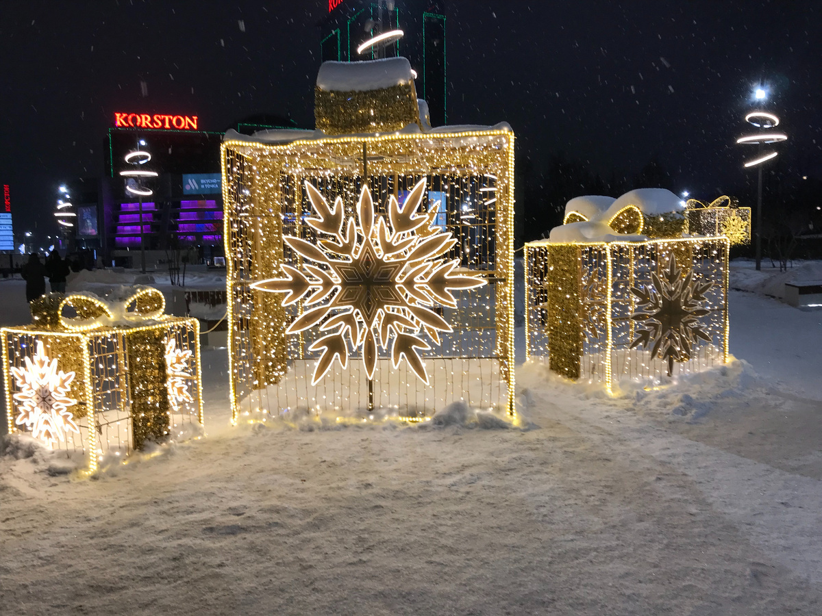 Вот мы и встретили Новый год. 2026 – немыслимая цифра! Отгремели хлопушки, промелькнули праздничные дни. В этом году зима у нас волшебная и прекрасная. Осень была такой тёплой и так долго не было снега, что любителям зимы стало грустно. В самом начале декабря снега ещё не было. А город уже начали украшать к новогодним праздникам – но украшения и огни смотрелись как-то нелепо и грустно без снега и льда. И вот на второй неделе декабря пошёл робкий снег, а к Новогодним дням зима уже расправила свои белые крылья и подарила нам красивые и незабываемые праздники, с санками, лыжами, коньками и снеговиками. Город наш украшен очень красиво, как всегда. Много огней, украшений и интересных придумок. Перед Парком им. Горького – привычная уже новогодняя шишка и целый ворох сияющих подарков, рядом с которыми любят фотографироваться взрослые и дети. Вот танцующие ёлки – целая шеренга. Красиво украшены были многие магазины и кафе. Мы заглянули в небольшой магазинчик на улице Жуковского, где продаются