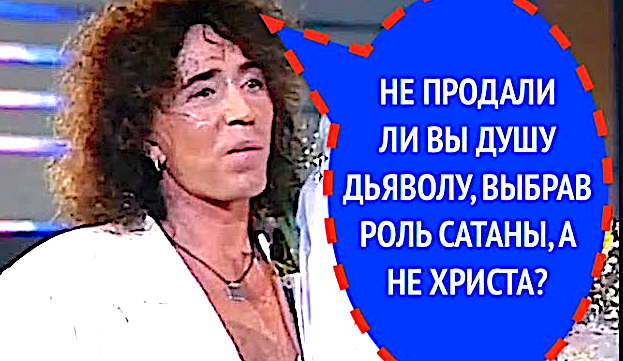 «Когда вам предложили роль Сатаны, вы согласились без колебаний, но от роли Иисуса Христа отказались. Не продали ли вы душу дьяволу в обмен на нескончаемый сценический успех и ваш потрясающий талант?» «Ну, во-первых, мне пока еще никто не предлагал такой сделки. А если бы ее предложили, я бы, наверное, подумал, как всякий человек в наше коммерческое время. Я, наверное, бы пораскинул сначала мозгами, как ответить на это предложение. Что касается роли сатаны, это ведь была, собственно, не роль сатаны. Роль сатаны — это слишком громкое определение. Роль предполагает буквально, так сказать, соитие с образом, соитие с предполагаемым персонажем, в коже которого, в теле которого необходимо прожить определенное время. Играть, играть. Я не играл сатану, я лицедействовал. Между этими понятиями есть большая разница». Заключение: Валерий Леонтьев не прошел Детектор Лжи. Причина: Артист применил тактику «циничного юмора» и «семантической казуистики». Он уклонился от прямого ответа на метафизический