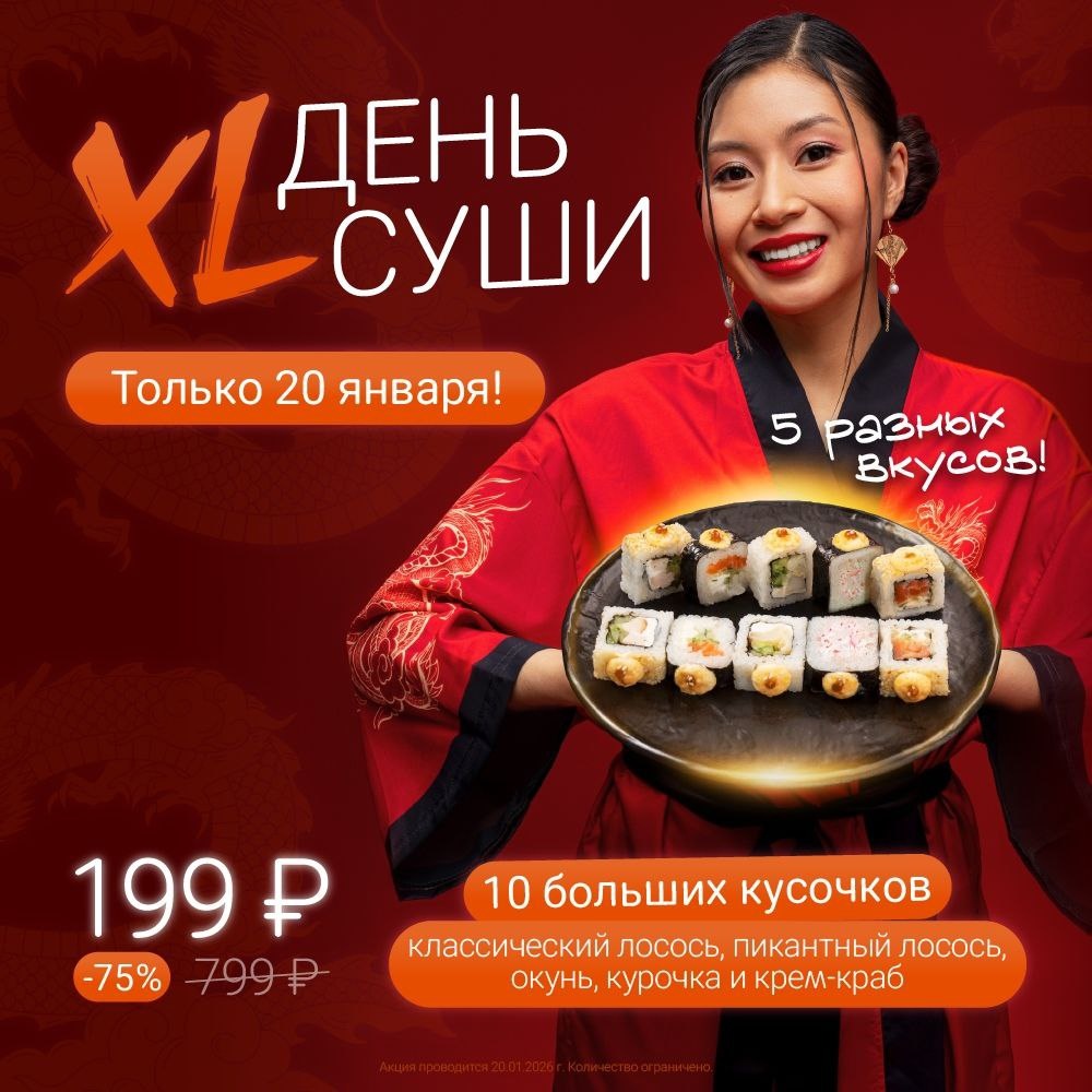 Громкий. Вкусный. XL. ⏰ Уже завтра XL День Суши! 🍣🔥 💥 Сет XL «Много вкусов» 10 больших роллов ❗ Всего за 199 ₽ Предзаказ доступен: den2026.sushifuji.ru роллы будут готовы к нужному времени.