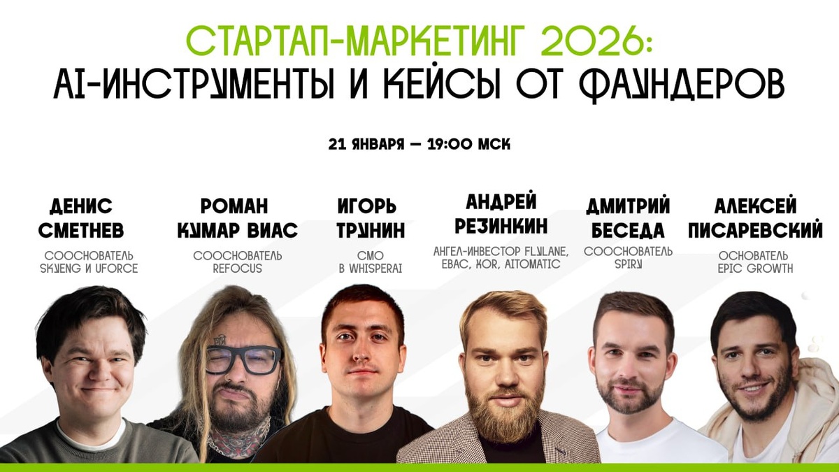 » До конференции «Стартап-маркетинг 2026: AI-инструменты и кейсы от фаундеров» осталось 2 дня. Самое время поближе познакомиться со спикерами. Андрей Резинкин — ангел-инвестор в Flylane (ex-Educate Online), InTone, XOR, EBAC, AITOMATIC. Синдикатор в AngelsDeck Global Ventures. Эксперт школы бизнеса Тинькофф. Основатель клуба фаундеров MFS. Роман Кумар Виас — фаундер Qlean, Qmarketing Agency, Qmarketing Academy и международной EdTech‑платформы Refocus. Лёша Писаревский — серийный предприниматель. Вайбкодит, делает AI Mental Health проект и Epic Web3 — ивенты для блокчейн-разработчиков по всему миру. ex Epic Growth, ex Mobio, MIPT Alumni Игорь Трунин — бросил CAD-системы и начал вести канал Tips AI. Занимается маркетингом и не только в WhisperAI. За год выросли до 170К+ активных пользователей, планируют запуск веб-приложения на рынок US. Дмитрий Беседа — кофаундер двух международных сервисов для геймеров, потратил более $20М на influencer marketing. Сейчас строит Spiry — экосистему