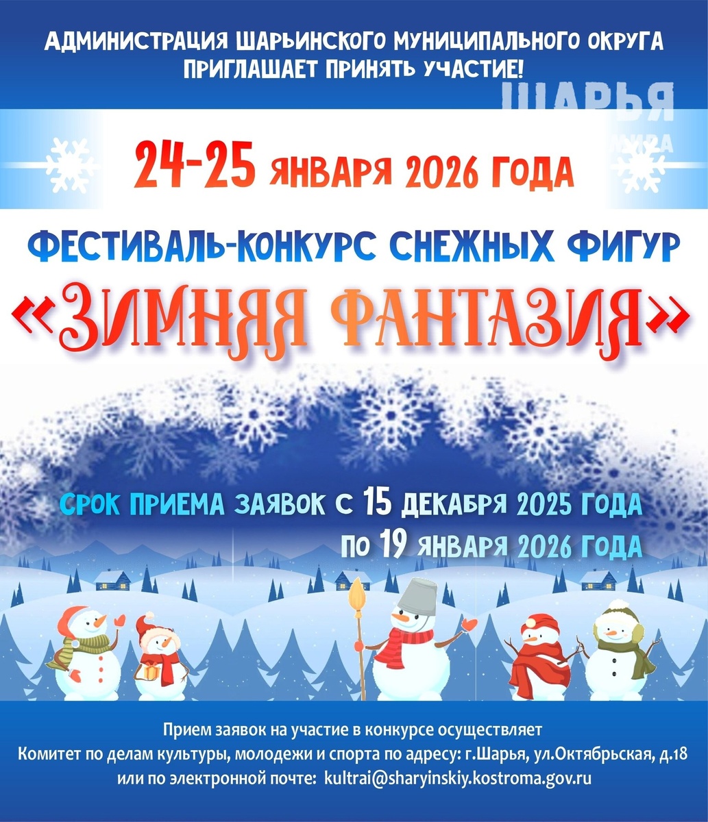 Шарьинский округ анонсировал проведение ежегодного конкурса снежных скульптур. Заявки от любителей-мастеров принимались более месяца. 24 и 25 января состоится юбилейный V конкурс снежных скульптур "Зимняя фантазия". Гостеприимное село Одоевское предоставляет скульптурам свои снежные просторы для воплощения в жизнь их зимних фантазий. Тема 2026 года: "Единство народов России". Организаторы конкурса гарантируют всем участникам хорошее, настроение, вкусный чай, дипломы и денежные призы победителям от 5 до 10 тысяч рублей. Шарья – столица мира Крупнейшее городское СМИ Источник: Открыть
