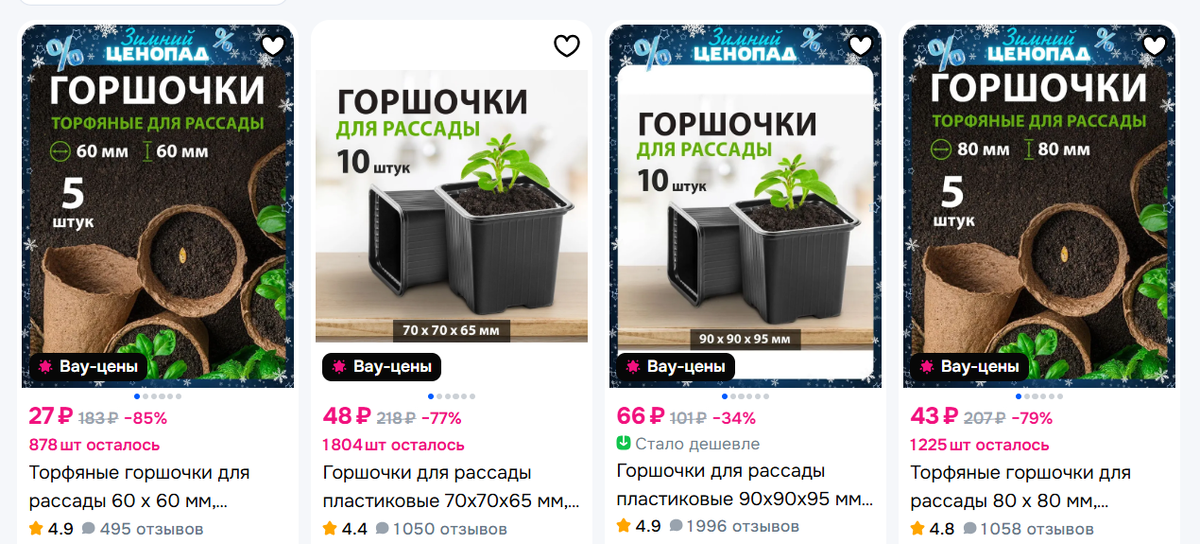 Но главное - теперь, когда вижу этот парад горшочков на странице магазина, понимаю, что прежде всего садоводы гонятся за дешевизной. Торфяной горшочек стоит в среднем 5-10 р. за штуку. Вот и берут их новички, думая, что для начала и так сойдет.