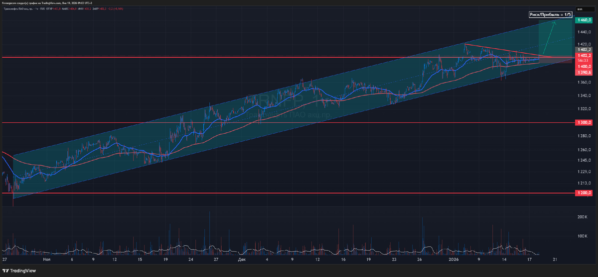 Наблюдал за ними ещё с декабря прошлого года, смотрелись сильнее рынка. В восходящем тренде с конца ноября 2025 г. Периодически торговали в клубе, сегодня согласна торговому плану купил акции Транснефти в спекулятивный портфель с целевым ориентиром 1460-1500 руб. Котировки после пробоя 1400 руб. консолидируются над уровнем. Есть вероятность, что рост котировок продолжится в сторону максимума 2025 г. на фоне роста тарифов. Тарифы на услуги Транснефти с 1 января выросли на 5,1%. С утра цена пробила локальную линию тренда в рамках коррекции в сторону восходящего тренда. Соотношение риск к прибыли составляет 1 к 5. Если вам близок ход моих мыслей и вы хотите быть внутри профессиональной среды, где обсуждают реальные рынки и реальные решения, — присоединяйтесь к закрытому инвестиционному клубу Finrange (отзывы). Оригинал статьи смотрите в нашем Finrange Журнале. Оперативно публикую посты в моем телеграм-канале, где около 20 000 подписчиков. С уважением, Дмитрий! Основатель сервиса по анализ
