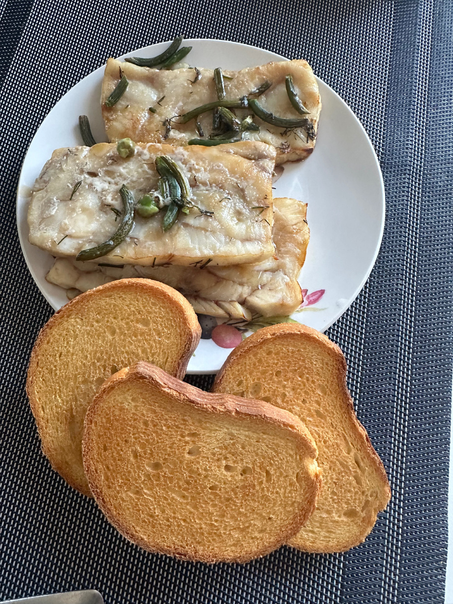 На фото хек. Не размораживала. Обмазала сметаной с солью и судим чесноком. Для антуражУ подкинула чесночных стрелок. 12 мин и готово. Без масла. Без жарки.