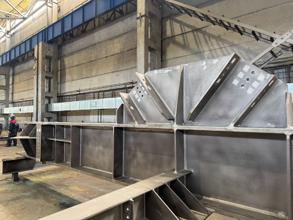 Каждый фасонный элемент изготавливался с полным проваром — множество К- и Х-образных разделок делали сварочную ванну большой и требовали многопроходных швов. Чтобы ускорить процесс, завод применил сварочную проволоку диаметром 5 мм при автоматической сварке под флюсом — это позволило сократить количество проходов до трёх и значительно уменьшить сроки изготовления.