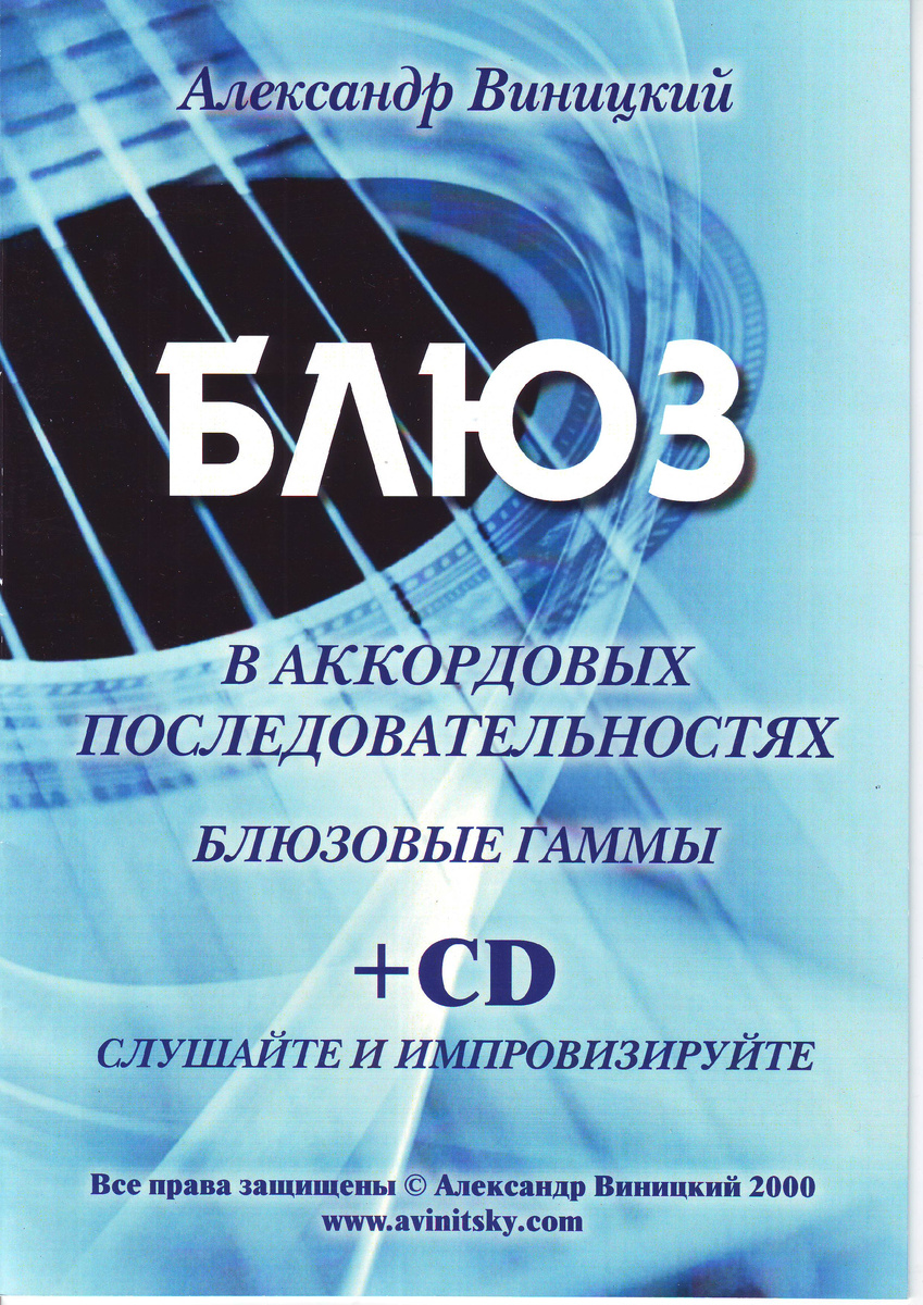 Сборник издан в 2000 году, но интерес к нему не ослабевает и мы решили напомнить как работать с этим пособием и с диском (всего 24 трека), а также ознакомить с содержанием. Сборник Александра Виницкого «Блюзы в аккордовых последовательностях» адресован тем, кто хочет овладеть в Блюзе основами аккомпанемента, гармонии, аккордовой техникой и импровизацией. Блюз, как музыкальный термин, происходит от американской идиомы to feel blue – пребывать в печали. Характерной особенностью Блюза являются блюзовые ноты – это пониженные III, Vи VIIступени мажорной гаммы, которую иногда называют «оминоренный мажор». Именно блюзовые ноты стали определять блюз, как грустную музыку. Это ошибочное представление о блюзе, т.к. Блюз не всегда грустный и медленный, а бывает Блюз быстрый и весёлый. В этой работе используется основная 12- тактовая форма мажорного и минорного Блюза, которая называется «блюзовый квадрат». Блюз имеет вопросоответную структуру. Это значит, что 12-тактовый Блюз состоит из трёх ч