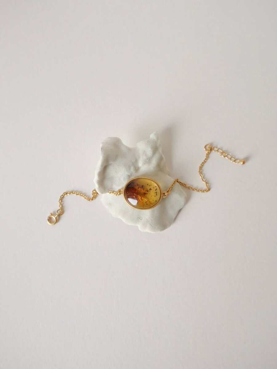 За счёт конструкции браслет можно подстроить под запястье в диапазоне +- 2,5 размера: — носить плотнее, если хочется чёткой линии; — оставить небольшой зазор — для слоёв, часов или более свободной посадки. Крючок даёт несколько преимуществ: он визуально легче классического замка, не утяжеляет низ запястья и не перетягивает композицию вниз — акцент остаётся на янтаре. Конструкция комфортна в повседневной носке и меньше «забирает» внимания, чем, например, жёсткий кафф-браслет. Модель выполнена из серебра 925 пробы и представлена в двух вариантах покрытия: матовая позолота и глянцевое серебро — оба читаются аккуратно и легко собираются в сочетания с кольцами и серьгами из нашей коллекции с янтарем.