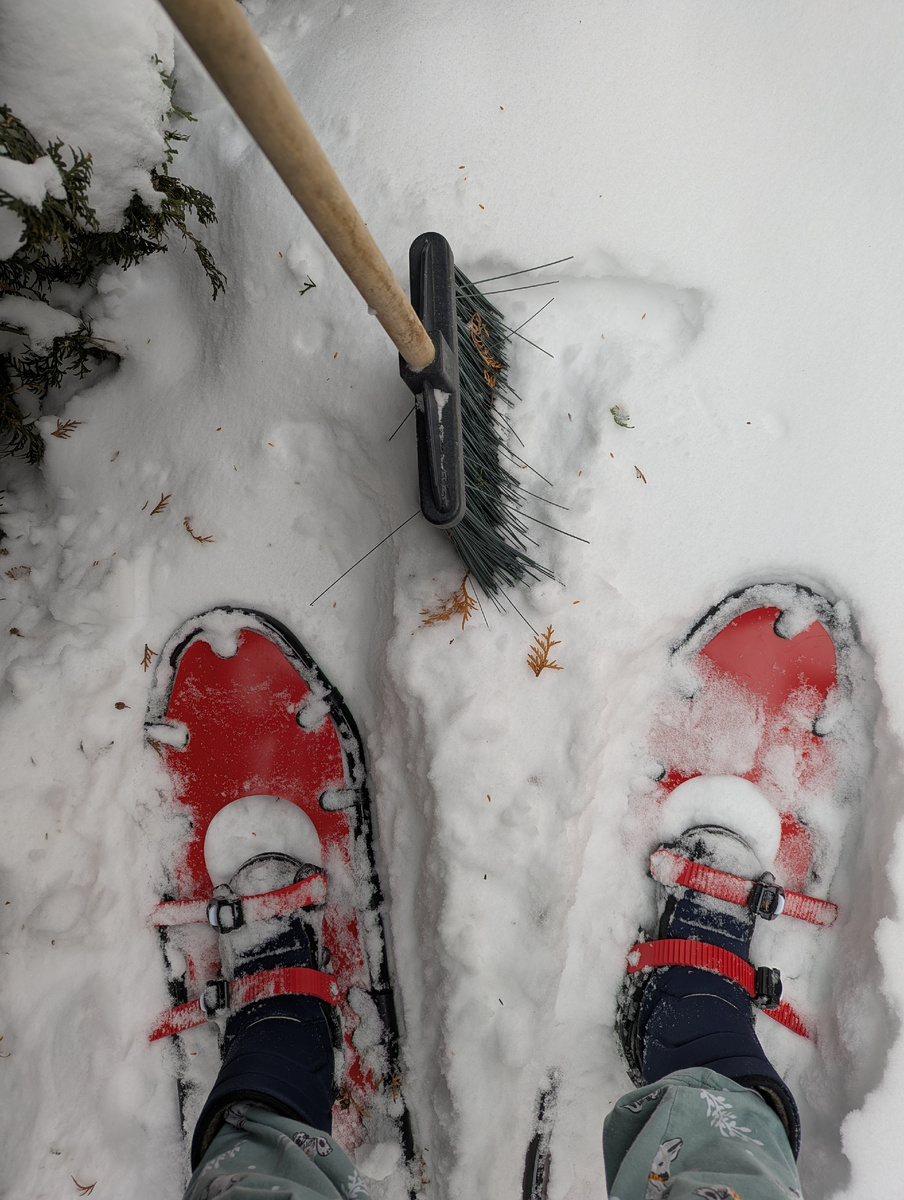 При помощи снегоступов главным образом хотелось отряхнуть колонновидные туи, на которых повисли огромные шапки снега: