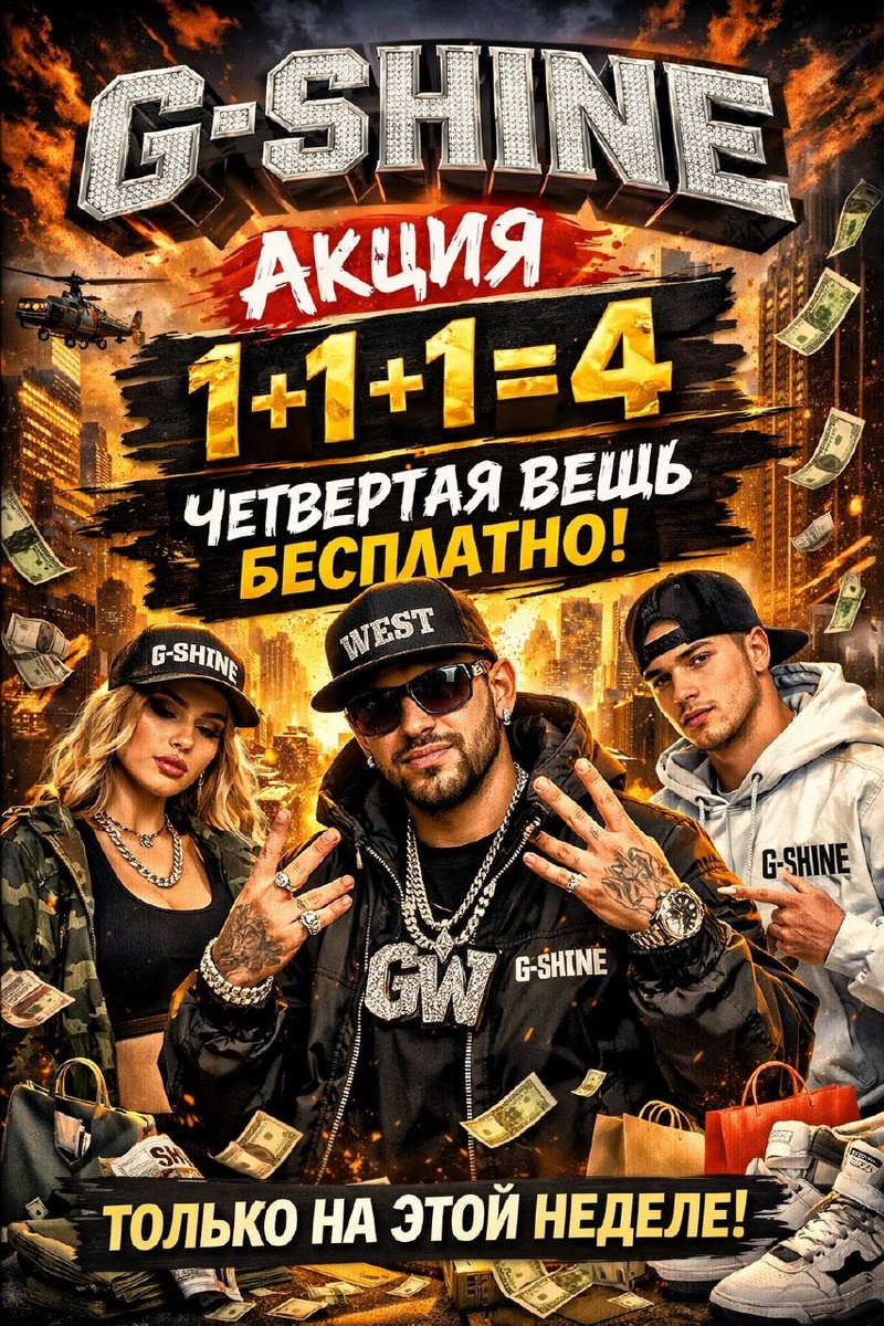 Улицы знают правила. Берёшь три — четвёртую забираешь бесплатно. 1+1+1 = 4 Без лишних слов. Без компромиссов. Это не просто шмот — это стиль, который говорит за тебя. Деньги уважают смелых, а стиль — тех, кто выбирает G-SHINE. ⏳ Только на этой неделе. Потом — поздно. G-SHINE Носи громко. Живи ярко. Забирай своё. 💥