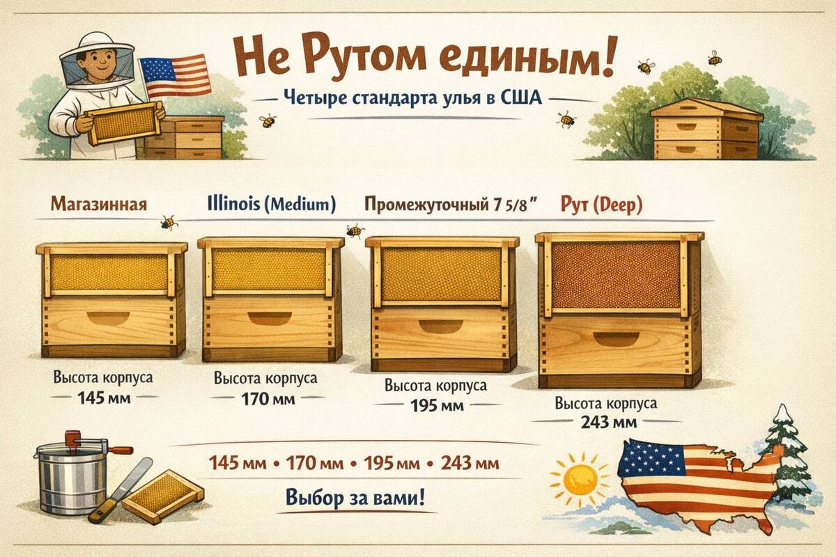 ! Когда говорят об американском улье Лангстрота, чаще всего вспоминают «Рут» с глубокой рамкой около 230 мм. Но если смотреть на реальную практику США, то по сути там давно существует четыре рабочих стандарта, которые пчеловоды комбинируют между собой в зависимости от климата, задач и удобства работы. Самый низкий — это магазинная рамка, или shallow. Высота корпуса у неё около 5 11/16 дюйма, то есть примерно 145 мм, а высота рамки около 135–137 мм. Это классическая медовая надставка, лёгкая и удобная, но редко используемая для гнезда. Следующий стандарт — Illinois, он же medium. Высота корпуса 6 5/8 дюйма, примерно 168–170 мм, высота рамки около 159–160 мм. Внимательные зрители канала заметили, что именно в таких двойных корпусах держит пчел Джон Нокс из последнего переведенного ролика. Пчеловоды, посетившие Алексея Ширяева во время Апифорума на Алтае, также видели, что пчеловод, по его же словам, инстинктивно пришел к этому размеру в более суровых горных условиях (видеоролик сегодня)
