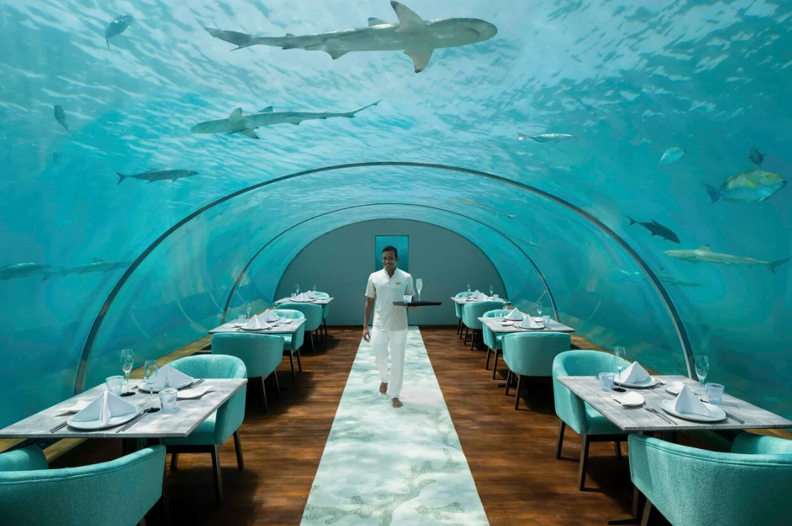 Ithaa Undersea Restaurant расположен на Мальдивских островах, рядом с одним из частных курортов. Посетители сидят в помещении, находящемся на глубине около пяти метров под водой, а прозрачная крыша из акрила позволяет наблюдать за морской жизнью и кораллами во время трапезы. Бар с видом на северное сияние