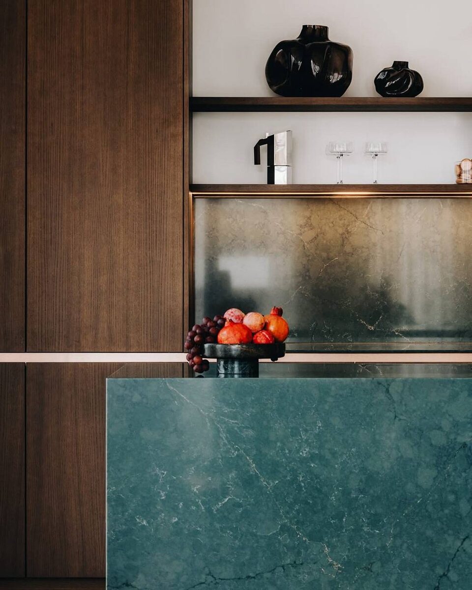 Главным элементом этой кухни является кухонный остров из зеленого кварцевого камня Silestone - Jardin Emerald. Он идеально сочетается с мебелью цвета ореха, светло-бежевыми тонами и деревянной столешницей из того же материала. Больше о кварцевом камне Silestone вы найдёте на нашем официальном сайте.