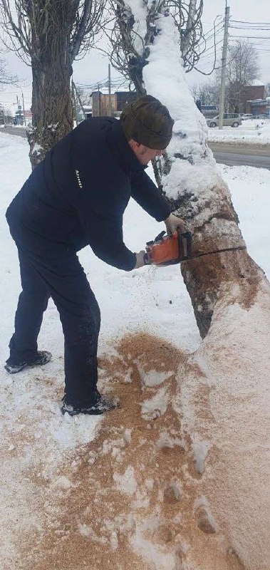 ❄️Сильный снегопад стал испытанием не только для хвойных, но и для хрупких тополей и белолисток. Сейчас работа идёт на ул. Ярославского - распиливаем очередное упавшее дерево.
