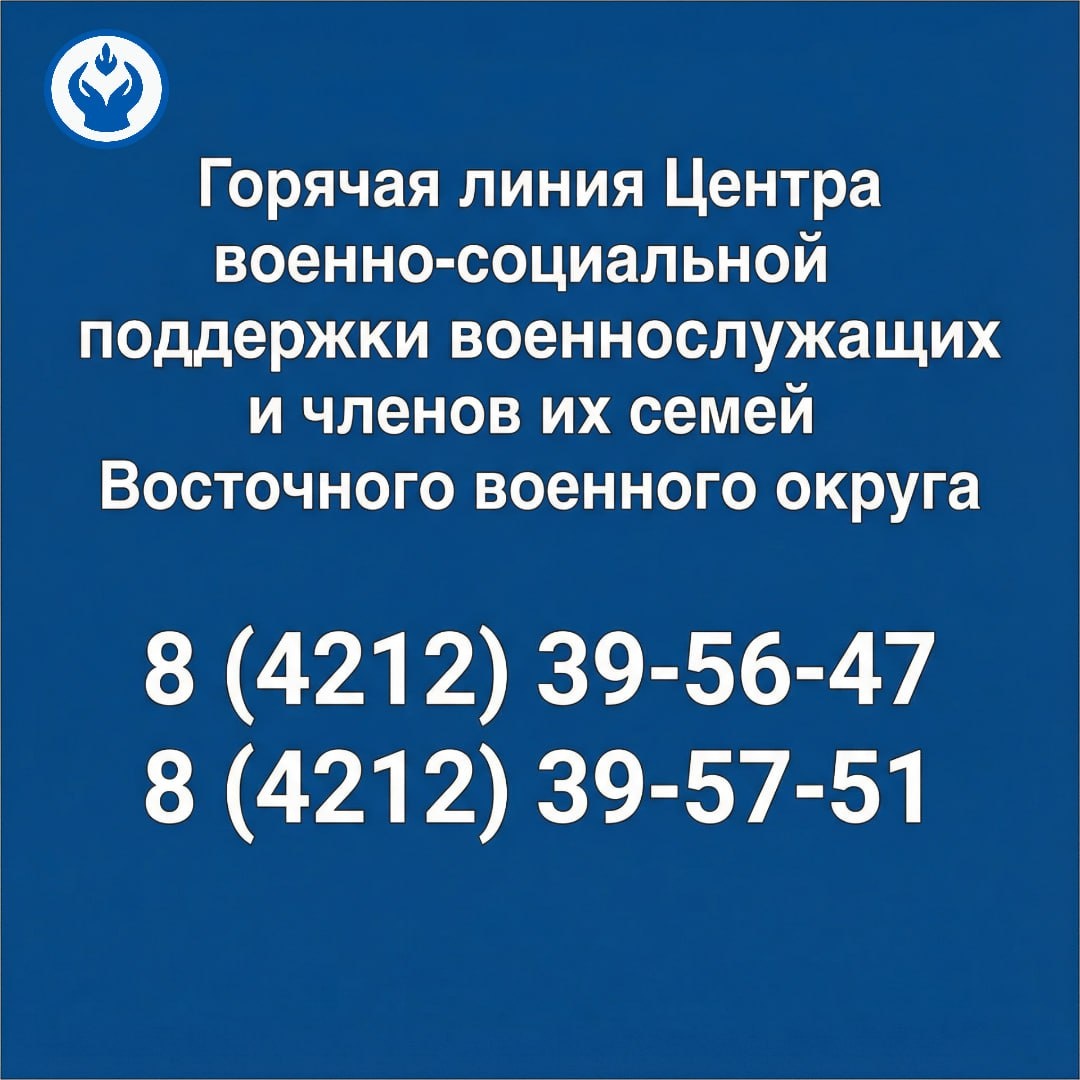 📌 В целях оказания всесторонней помощи и оперативного разрешения проблемных вопросов военнослужащих - участников специальной военной операции и членов их семей. По этим телефонам военнослужащим и членам их семей доступны: ✅ решение социальных вопросов ✅ страховое обеспечение ✅ юридическая консультация ✅ соцподдержка и адресная помощь Восточный военный округ (все регионы ДФО) 📞 8 (4212) 39-56-47, 8 (4212) 39-57-51
